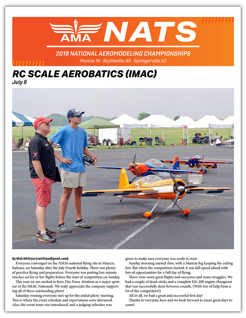 The 2019 RC Scale Aerobatic (IMAC) Nats were held July 7-10 at the International Aeromodeling Center in Muncie, Indiana. See all the highlights of this year's event and final results with our NatsNews 2019 IMAC Edition. NatsNews: 2019 IMAC