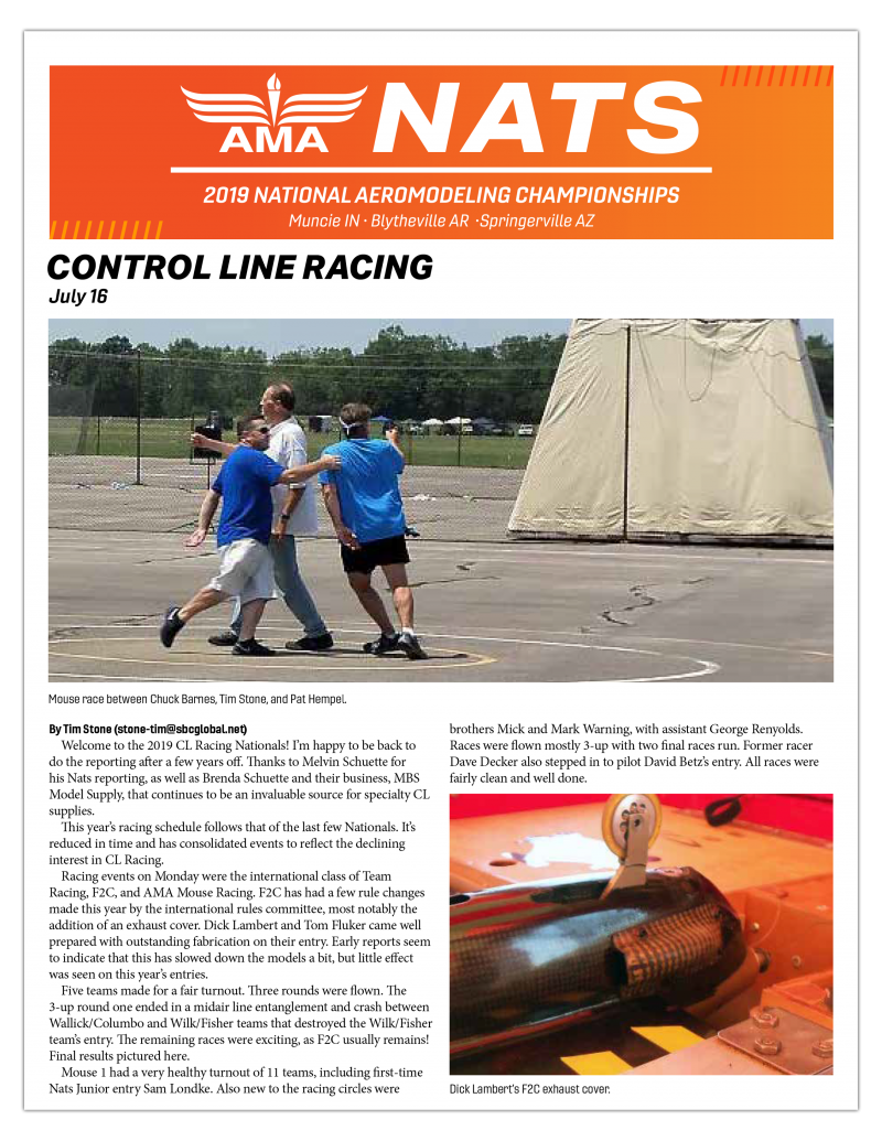 The 2019 CL Racing Nats were held July 15-18 at the International Aeromodeling Center in Muncie, Indiana. See all the highlights of this year’s event and final results with our NatsNews 2019 CL Racing edition.