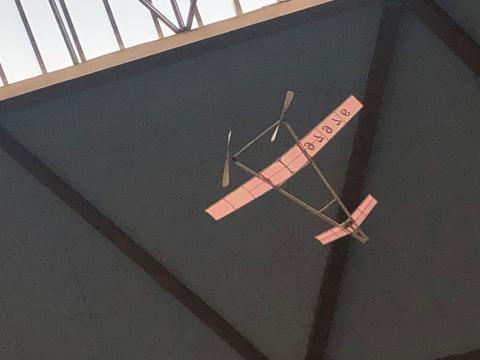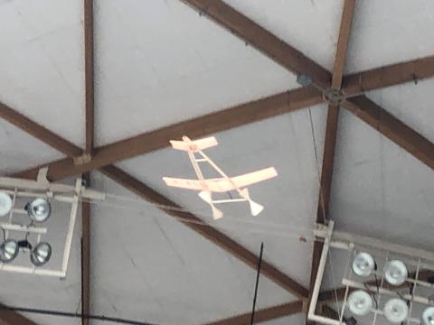 I spent the first minutes of Saturday freeing my Limited Pennyplane from a hang-up. It spent the night about 65 feet up between a row of lights. I’d had a really good flight going Friday night when the ship suddenly drifted behind the lights and wrapped itself in a coil of electrical cord. At first it looked unlikely that I’d get it down, but a single bump from a balloon freed it with only a slightly broken fin. Five minutes later I was back in the air and managed a 10:44 in Pennyplane and 11:32 in Limited Pennyplane shortly thereafter.