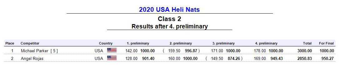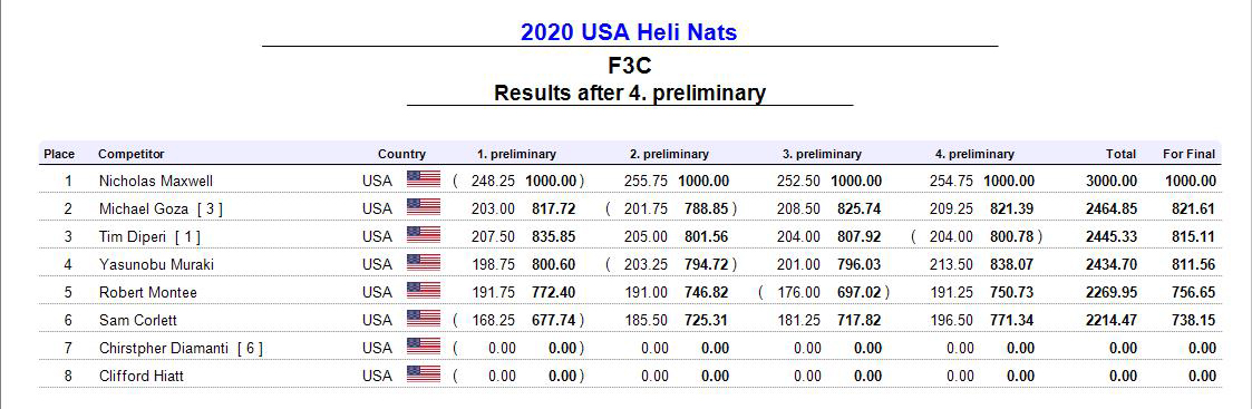 In the F3C class, Nicholas Maxwell leads after the preliminary round by a sizeable margin. However, the next three competitors, Mike Goza, Tim Diperi, and Yasunobu (Nob) Muraki, and are all separated by only 11 normalized points. With the competition changing over to the more challenging F schedule for the final three rounds, it’s shaping up for an interesting battle for second, third, and fourth place.