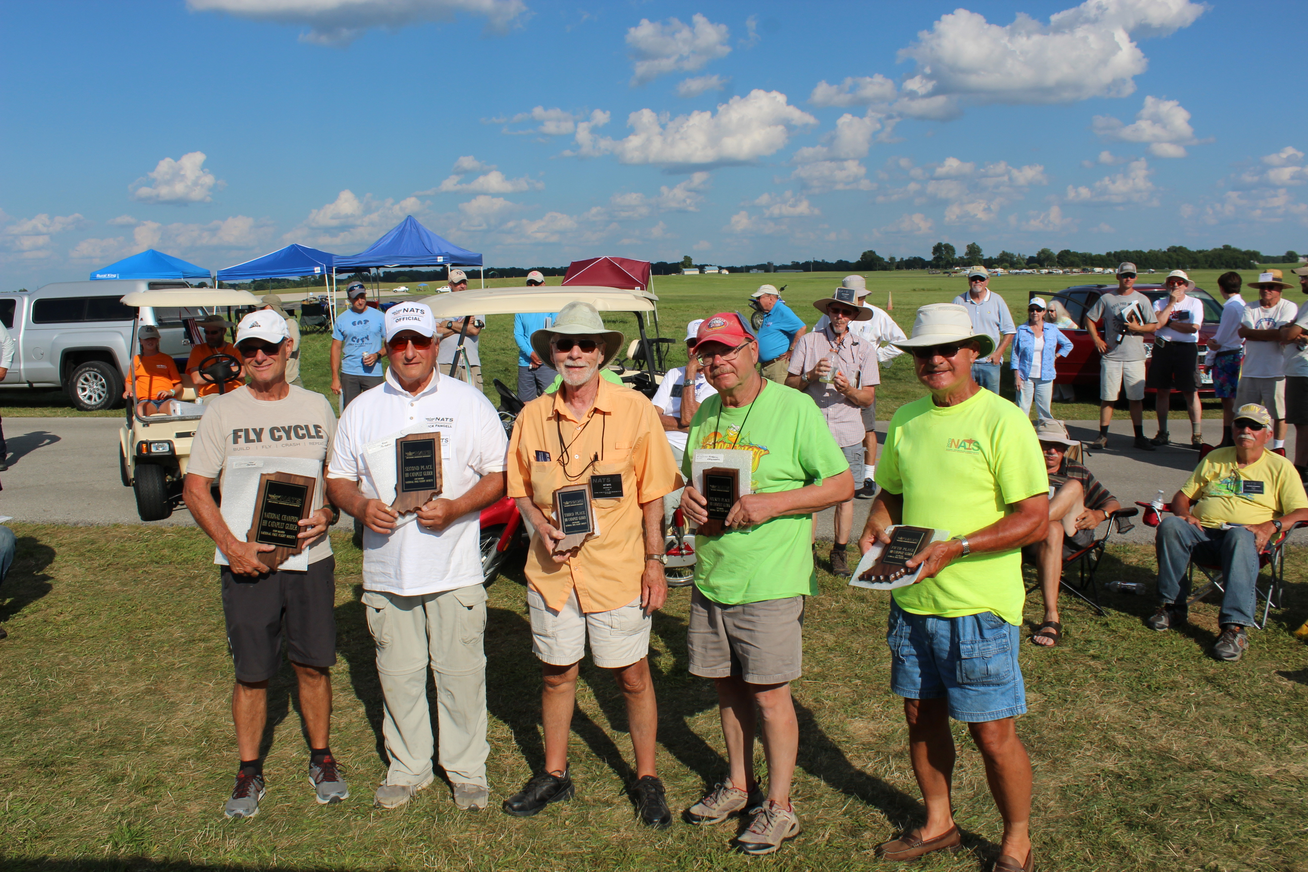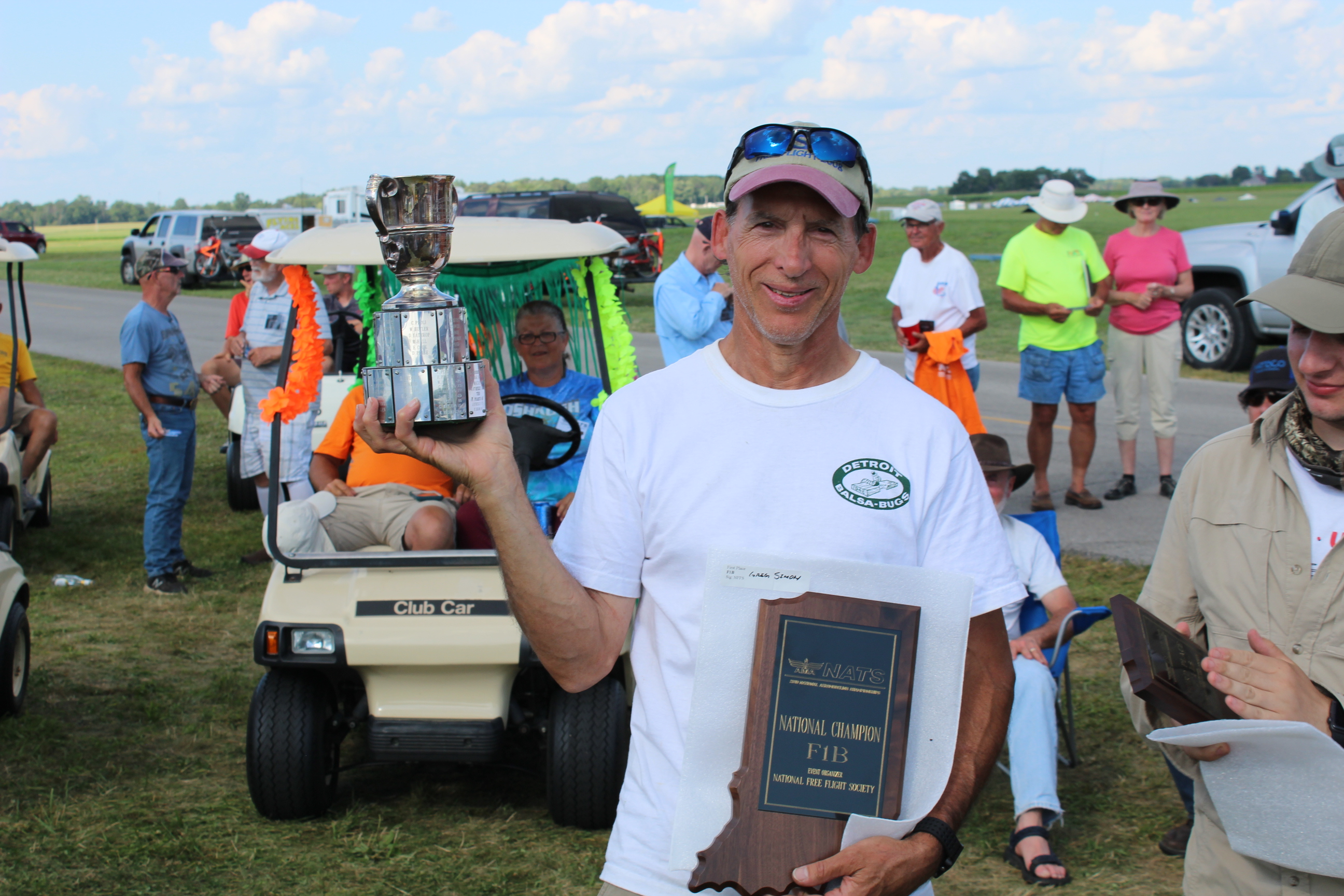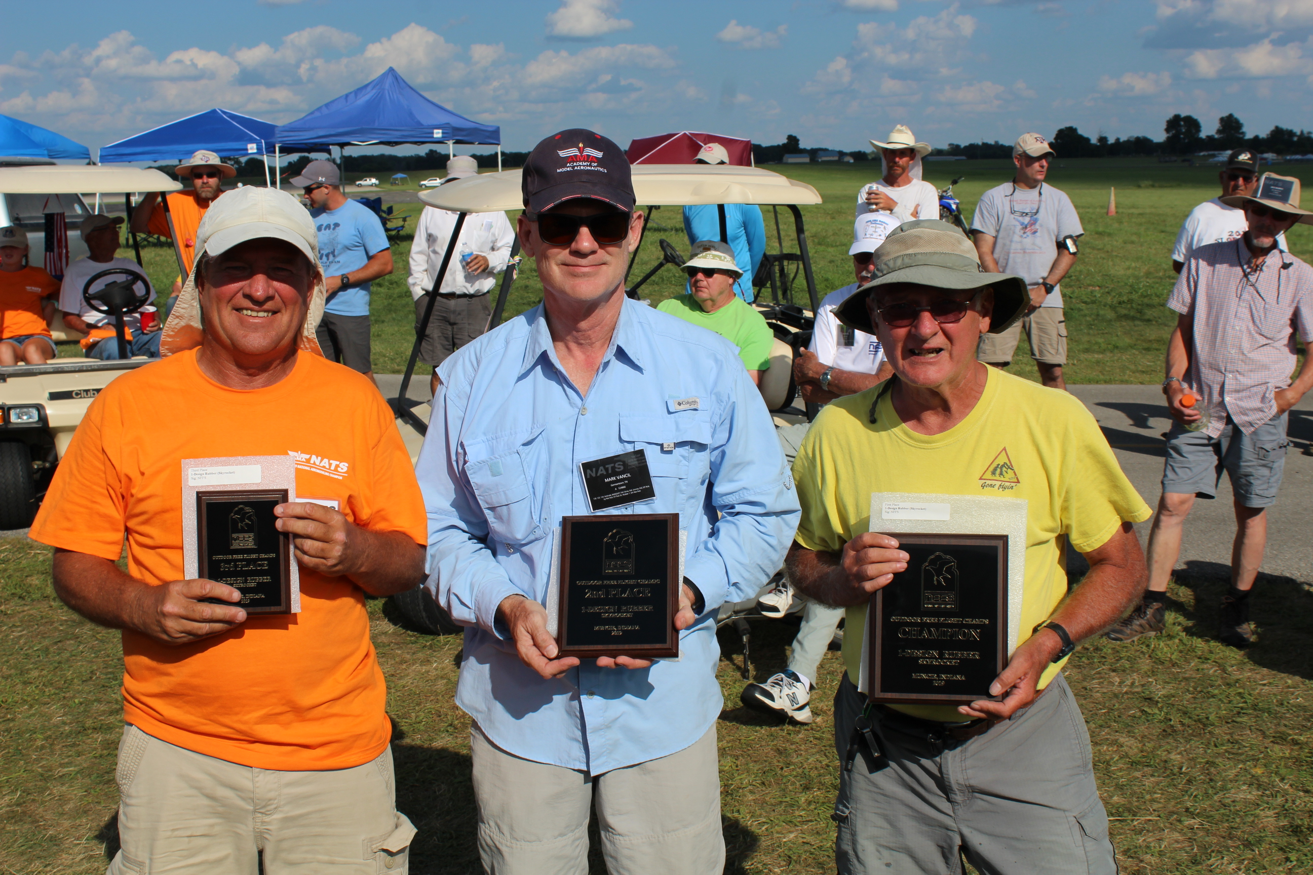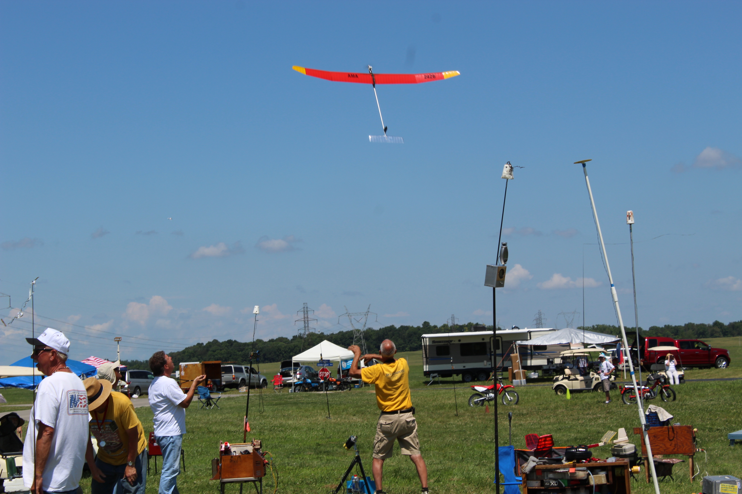 F1B fielded nine fliers. This contest is flown in rounds, seven by the rules at major contests, and maxing out can be a challenge for all seven rounds, especially with the max at 180 seconds. Only four maxed out and flyoffs determined the winner. Greg Simon won with a 1,490, just 26 seconds ahead of Aram Schlosserg who was only 4 seconds ahead of Brian Pacelli, former Junior Team member.