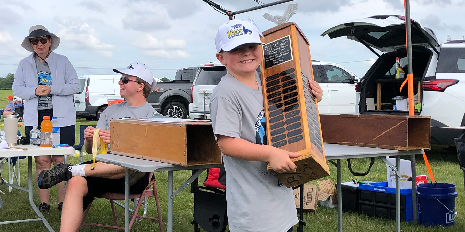 And now, a special treat for everyone. Tyler Skukalek is, if I had to guess, 9 years old. I do not know for sure. He was the only flyer in Basic, so naturally he won. He was the only Junior in the group of Basic and Beginner, so he got the perpetual Juniors for Basic/Beginner trophy. The trophy is about as big as he is, and you have got to see his smile when he gets it. It will warm your heart and make your bad day go away. It is literally from ear to ear.