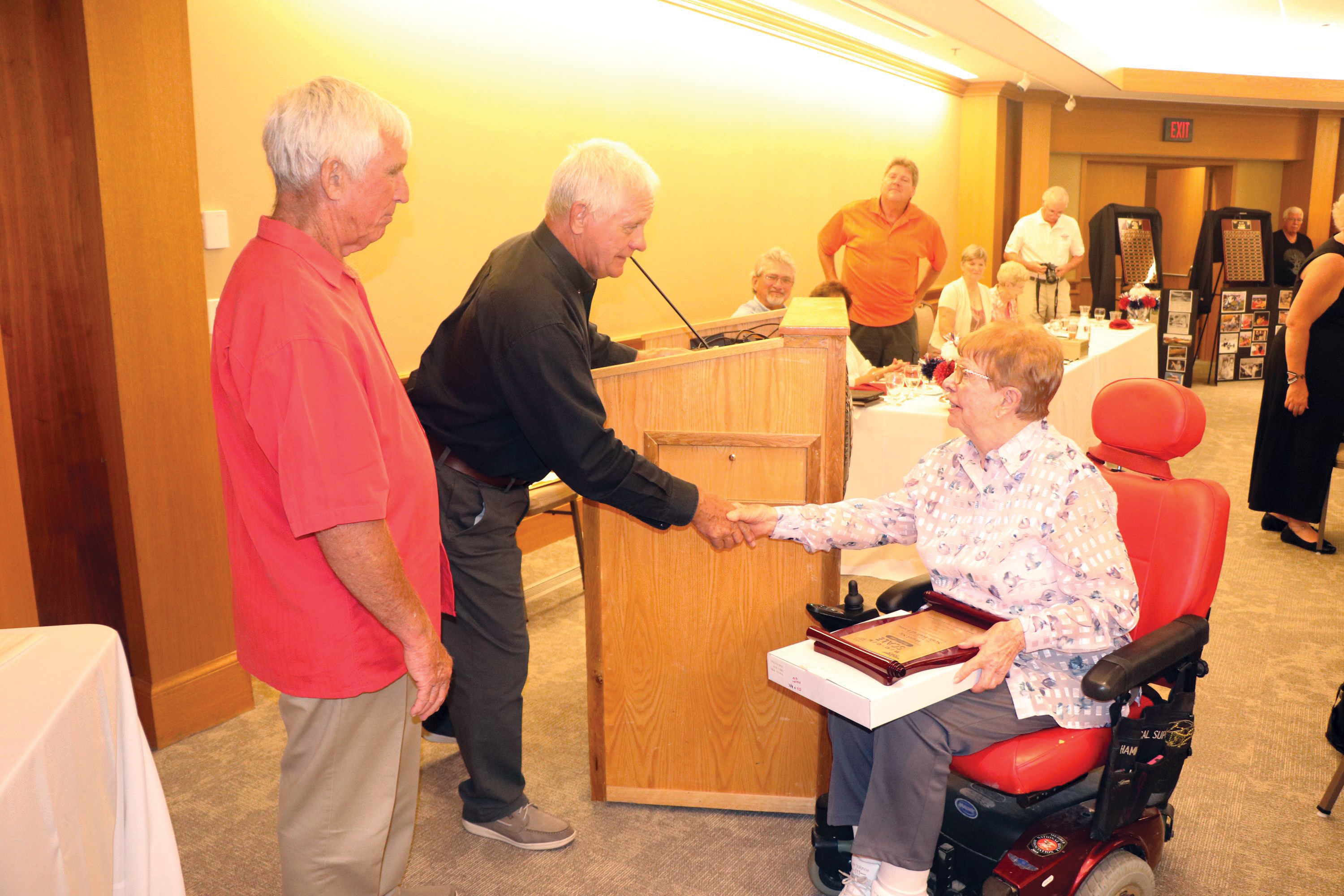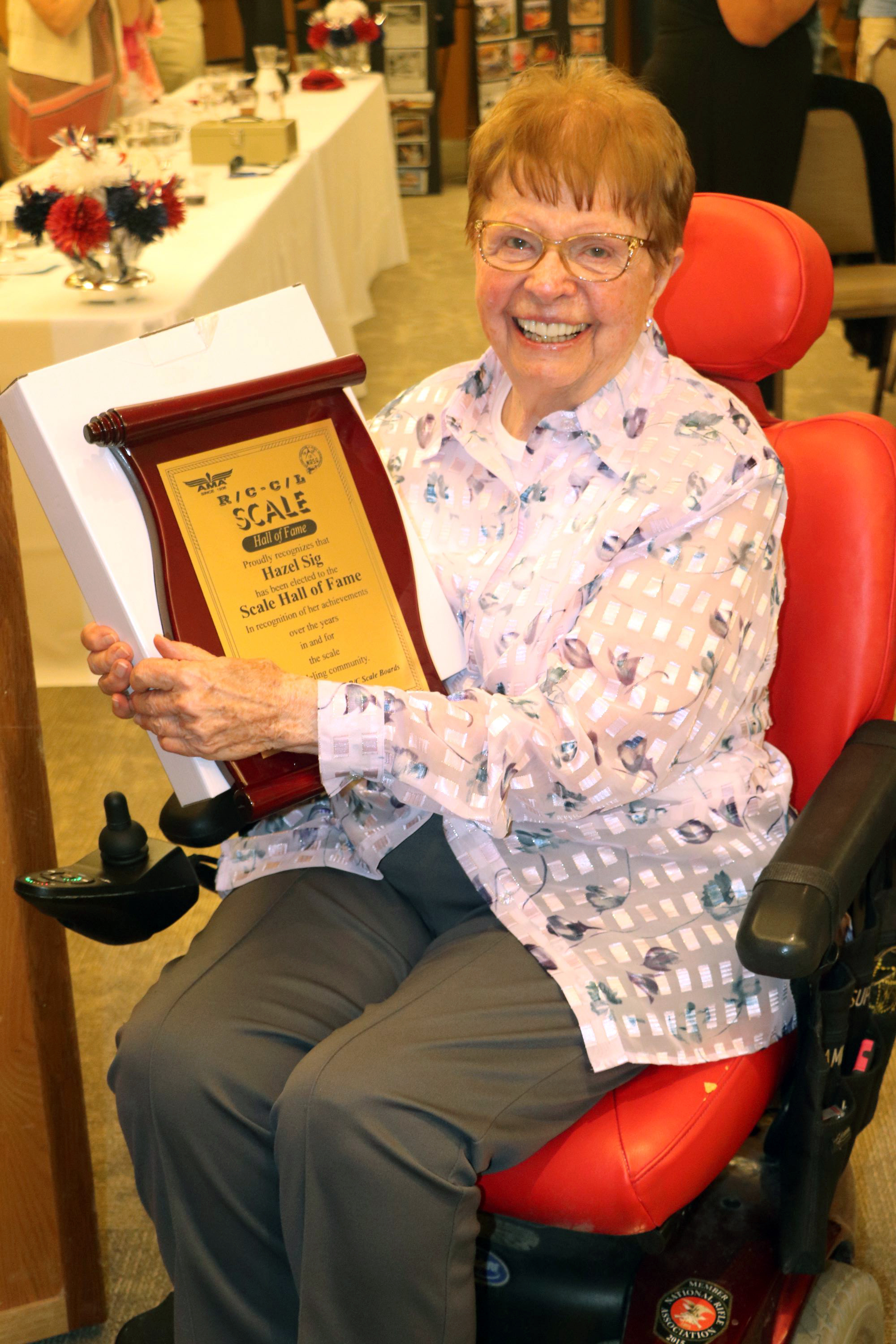 The special guest of the evening was Hazel Sig. She was inducted into the CL and RC Scale hall of fames. After she received her award, she told the whole group how she drove her Corvette at high speeds and other events including full-scale aircraft. The contributions that Sig Manufacturing has given to Scale modeling are extensive and were publicly recognized by awarding Hazel the CL and RC Scale hall of fame awards.