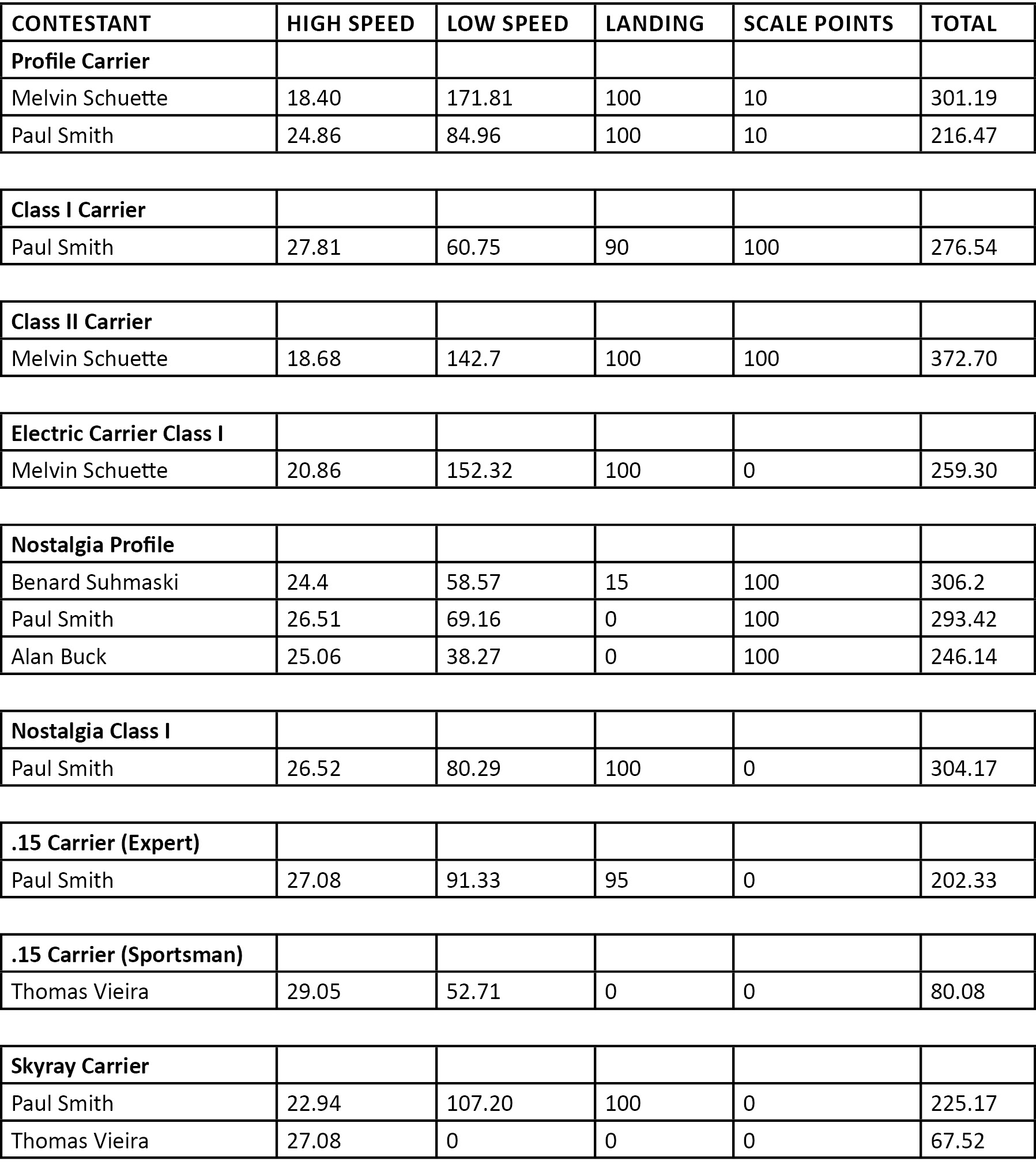 In honor of Eugene Ely, the man who made the first aircraft takeoff and landing from a carrier ship, the Navy Carrier Society awards the Eugene Ely award to the person who accumulates the highest total in three classes of the official events. With a score of 933.19 points, this year’s Eugene Ely award was awarded to Melvin Schuette.