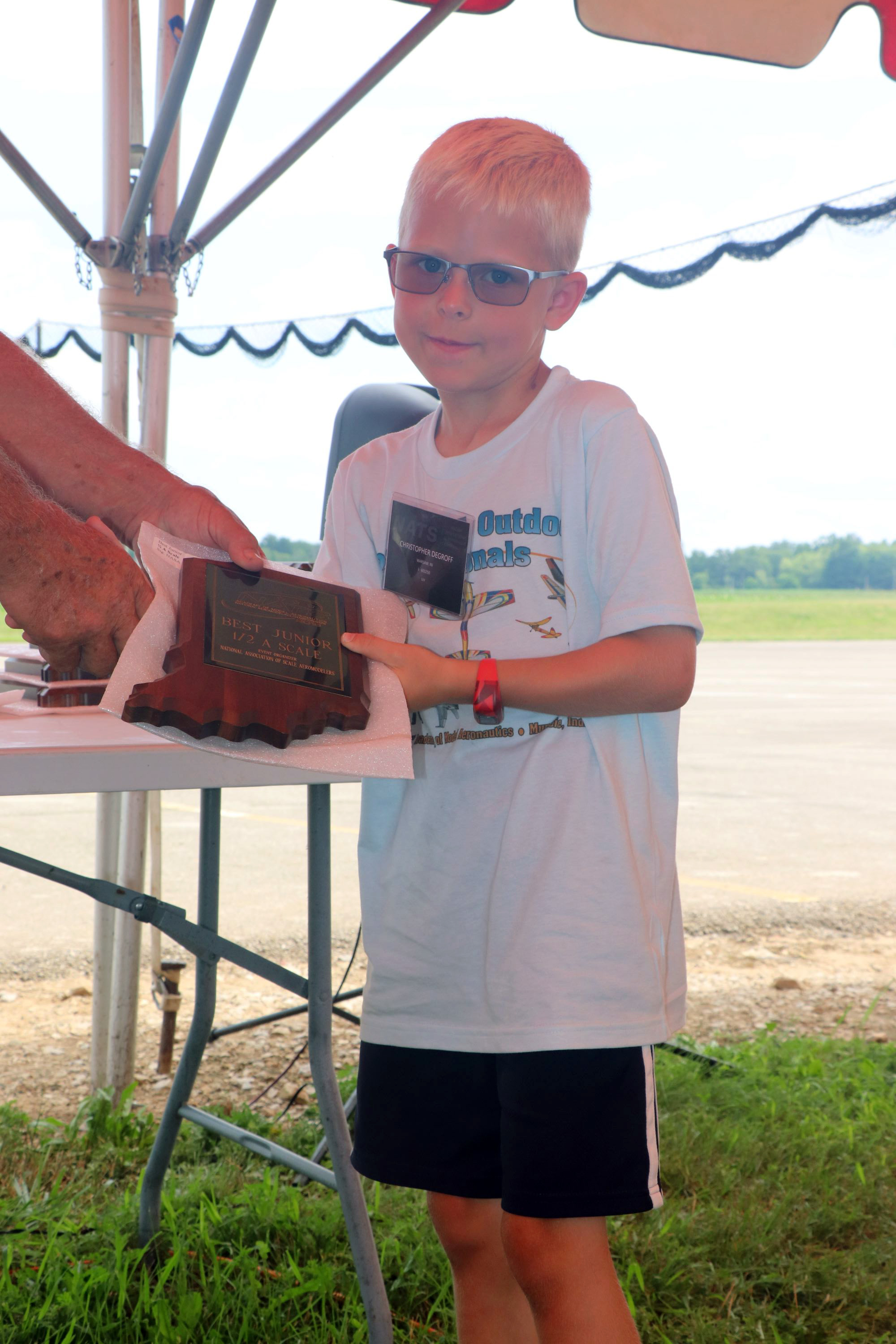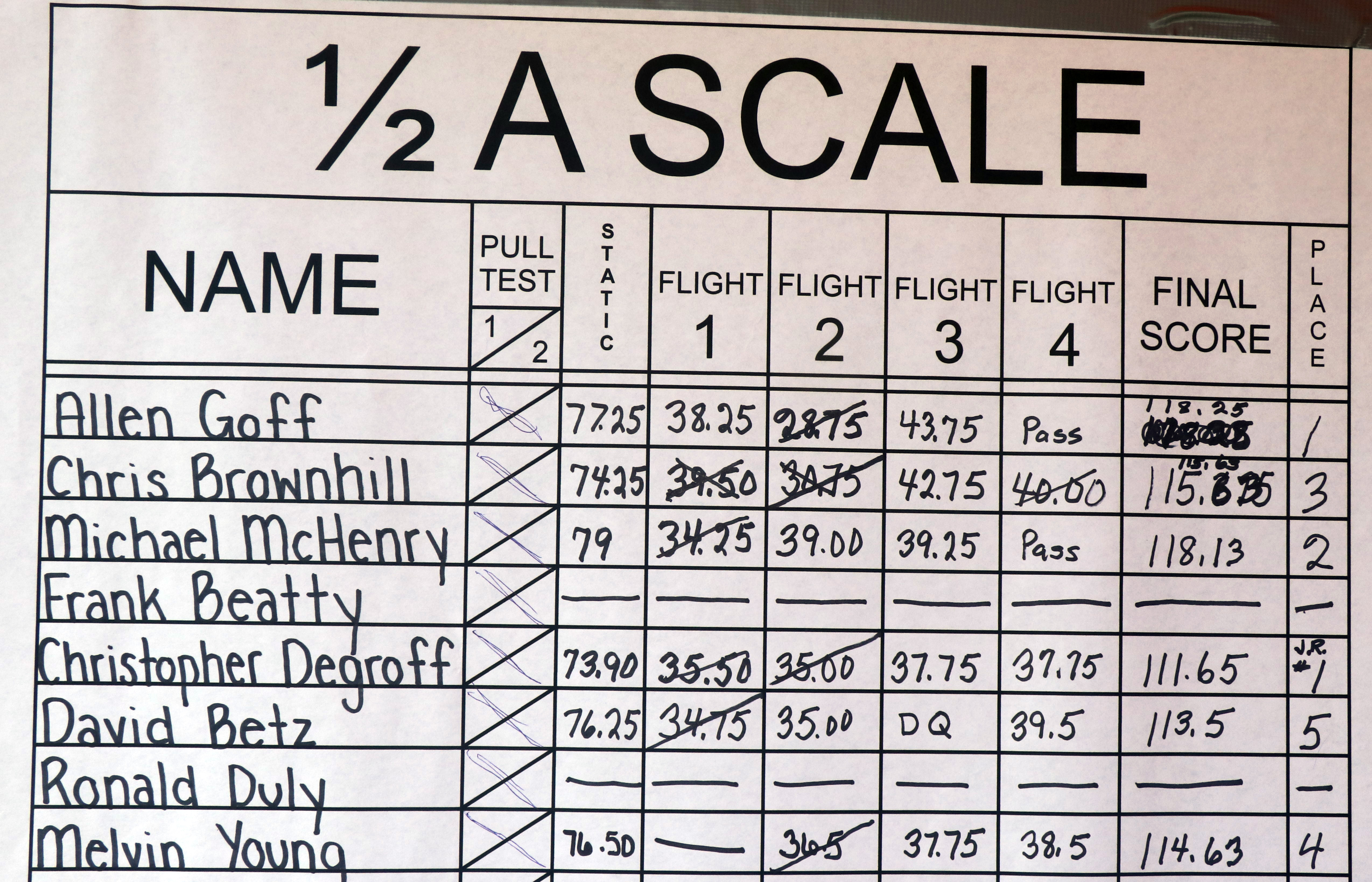 The 1/2A Scale contest had the most entries, and up until Sunday morning, Christopher DeGroff was beating his grandfather, Dave Betz, in 1/2A scale. Dave put up a better flight on Sunday to get a better overall score than his grandson. Allen Goff got first place with his B-25, Mike McHenry got second place, and Chris Brownhill from Canada got third place. Christopher’s 1/2A Scale entry was an older Brodak Wildcat that was donated to him.