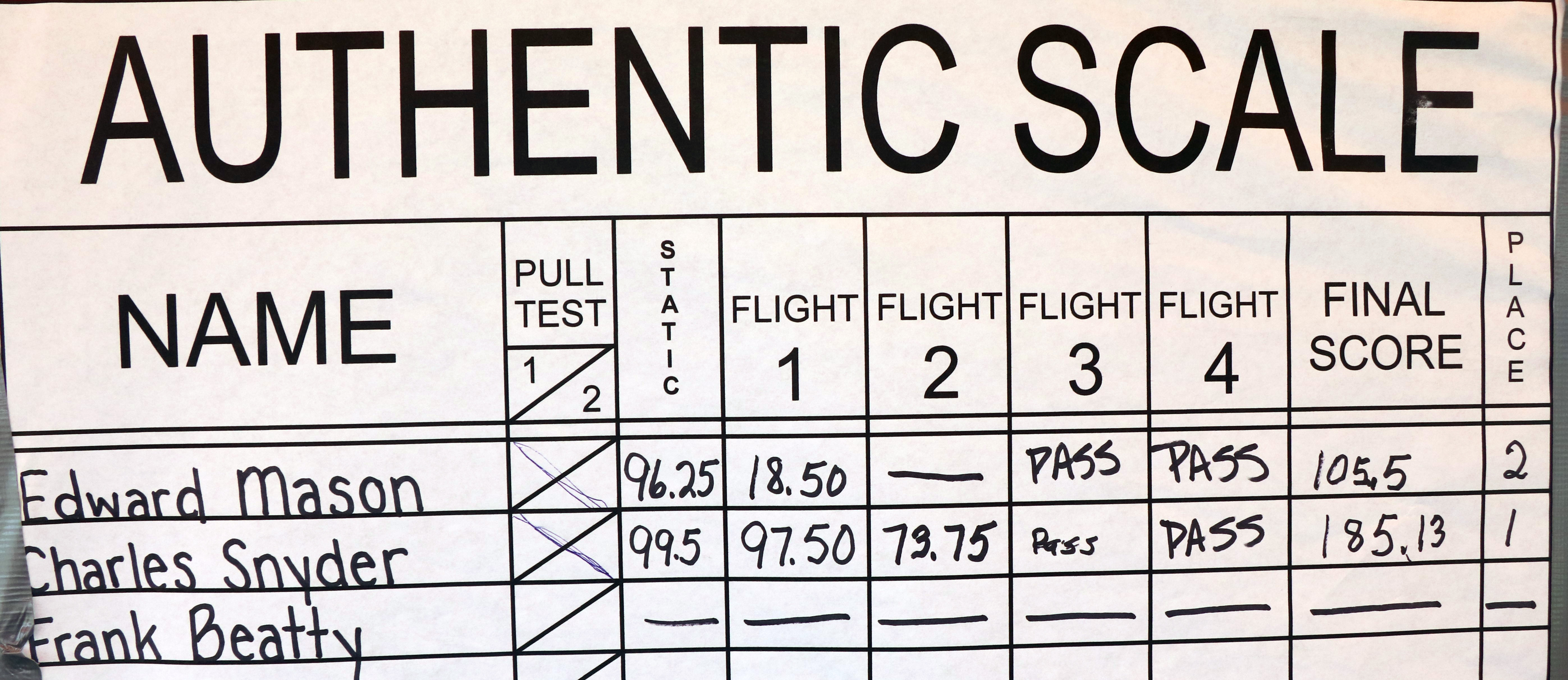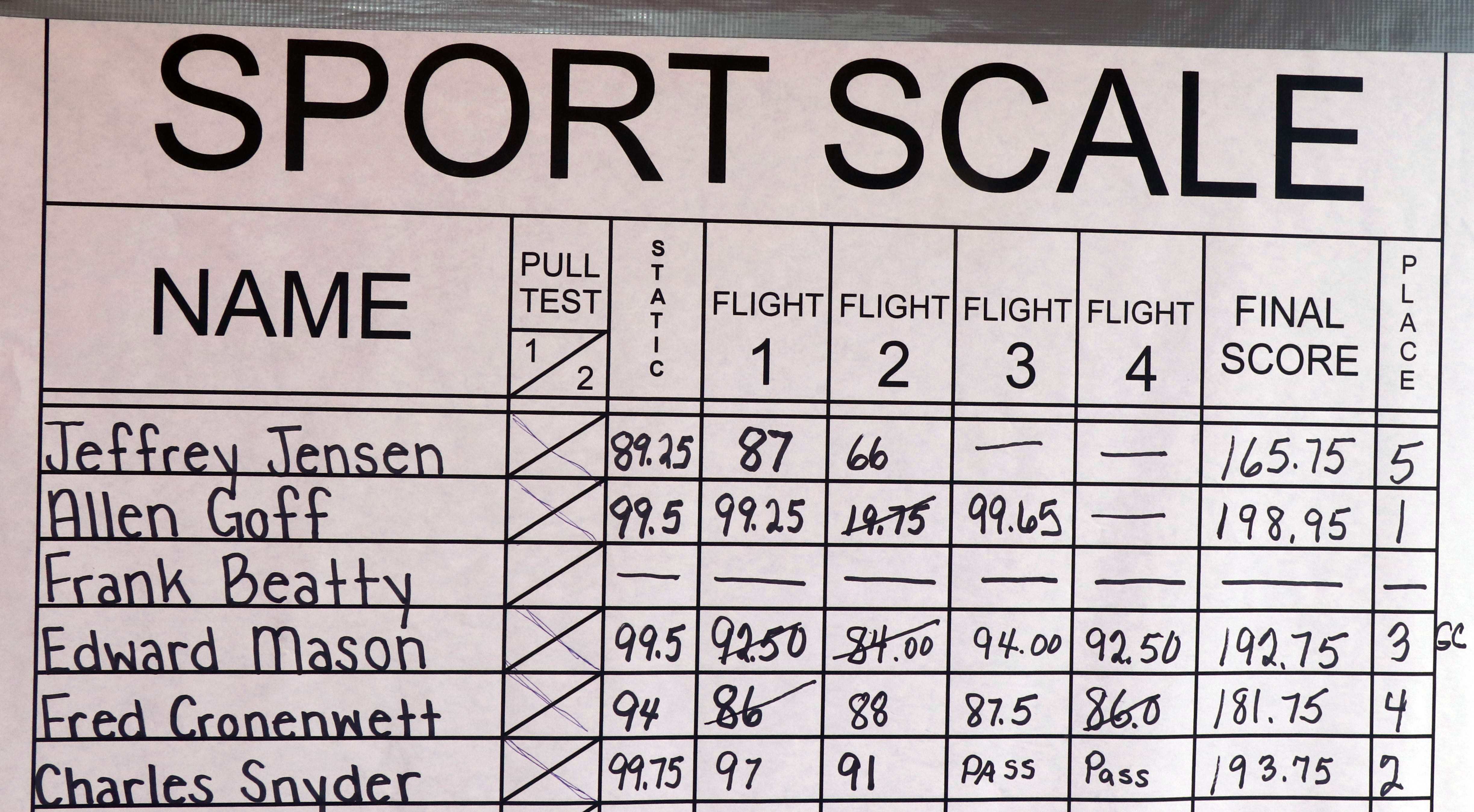 Sport Scale was won by Allen Goff flying his new Nieuport 17 biplane and Chuck Snyder took second place with his Typhoon. There was only a 1-point difference between second and third places, with Ed Mason taking third place. Ed and Fred Cronenwett were the only two pilots to fly all four flights and Ed won the Grand Champion award.
