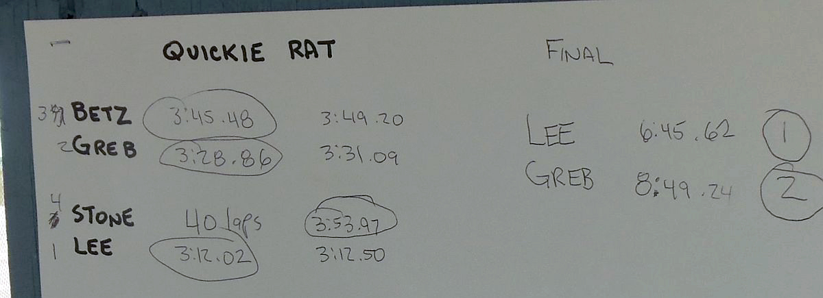 Nine entries made for a good turnout and 3, 3-up races. The format this year was to give each contestant 2, 80-lap back-to-back races. All times were then sorted from fastest to slowest, and divided into gold, silver, and bronze races. By doing this, everybody got two preliminaries and a final race.