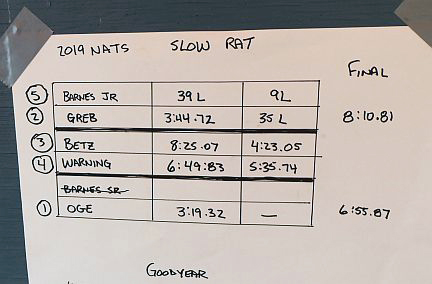 By race time, the wind had picked up even more and the tail-end of tropical storm Barry was looming. Everyone except Mike Greb failed to post a heat time. Bob Oge’s exceptionally fast O.S. .15 RX blew off about 1 inch of the carbon-fiber propeller tip! No final was run because the event was rained out. Finishers were first, Greb/Bischoff; second, Barnes/Barnes; and third, Betz/Stone.