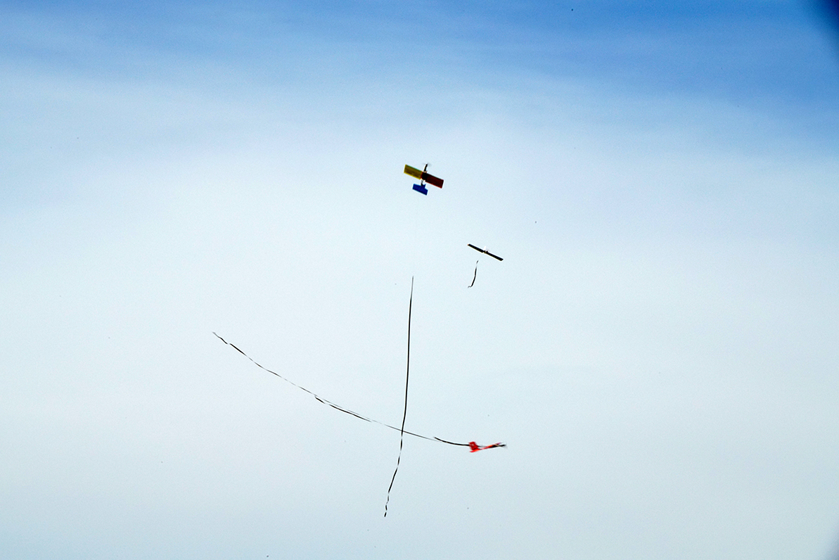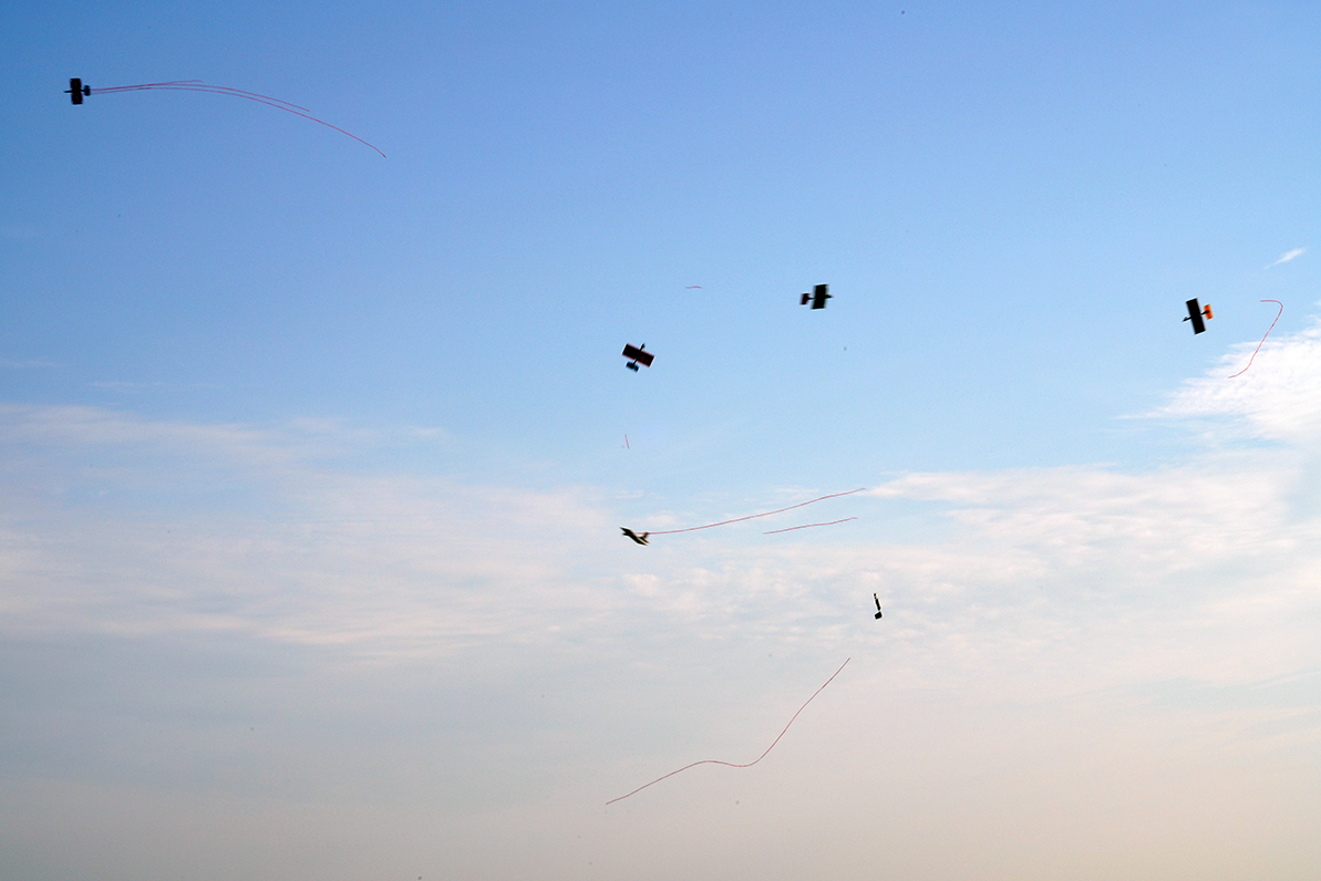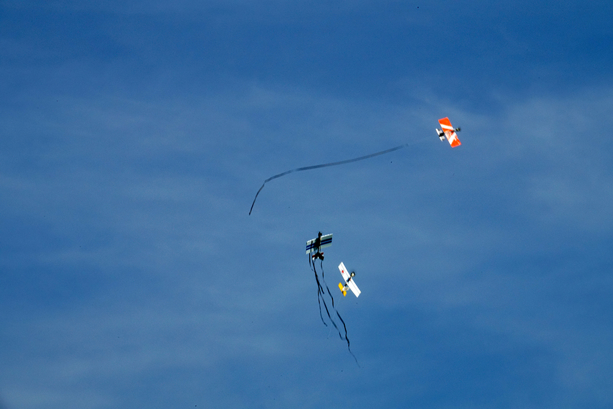 After Open B wrapped up, the E-1000 planes were broken out again and Bob Loescher joined the fight today. Unfortunately, Dirk Oosting slipped in the standings after crossing the pilot line on launch and then was out for the day with no more airplanes to fly. Crepe paper streamers were able to be used and are much preferred in E-1000 because the slow and lightweight planes struggle to cut the red flagging tape.
