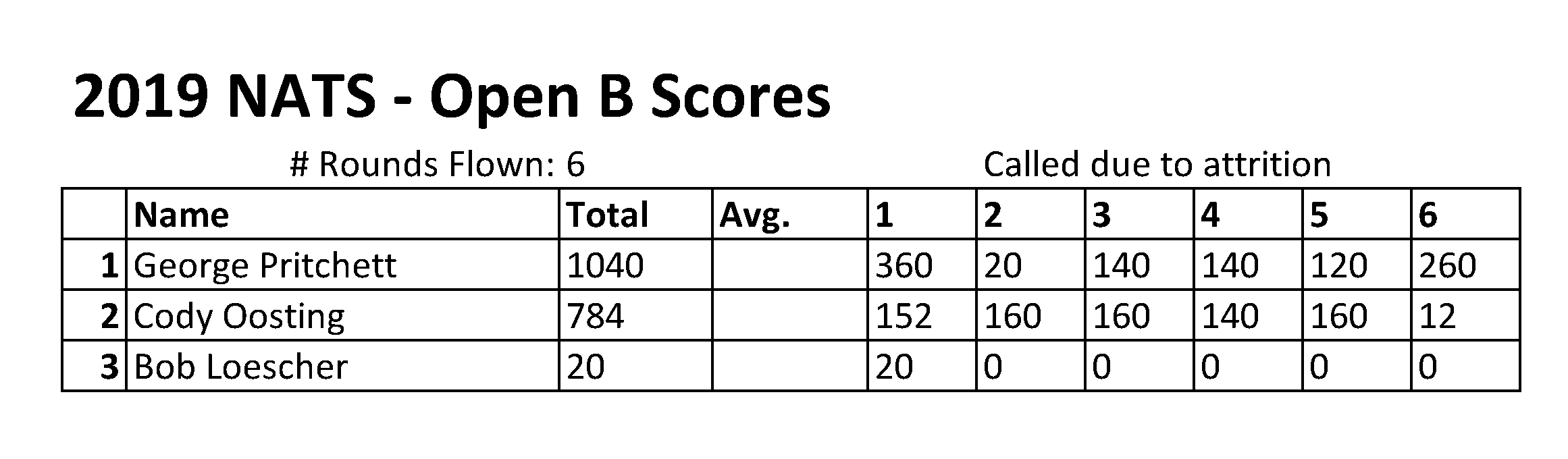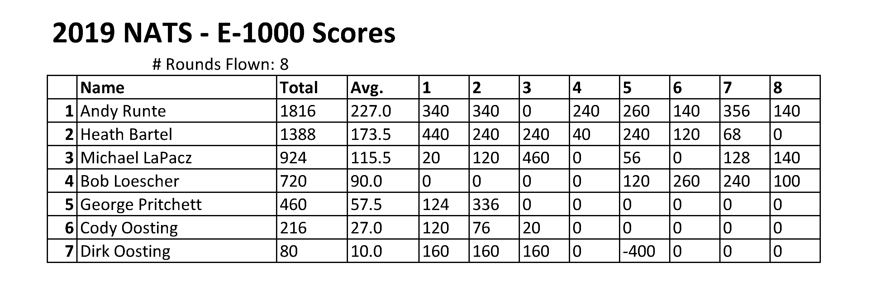 George Pritchett loaned Cody Oosting a plane so that there would be three pilots flying. It quickly turned to only two pilots when Bob Loescher had water issues with his gear. With only the two of them, George and Cody agreed to fly just six rounds to determine the winner. George was having motor troubles throughout the rounds. But in the end, Cody Oosting ended up in second with 784 and George Pritchett took home first with 1,040.