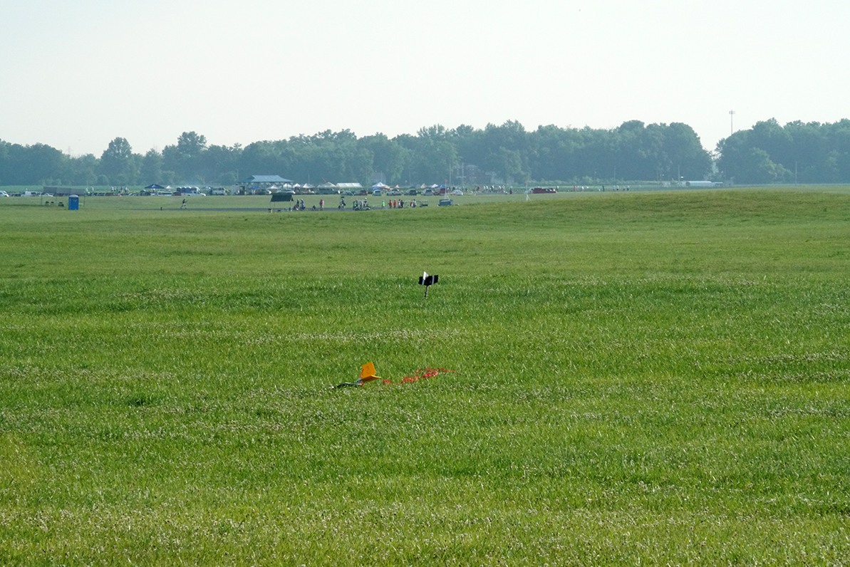With only seven pilots flying GNAT this year, we went all up once again. The heavy morning dew forced the use of red flagging tape streamers again. The scoring was average until the grass finally dried enough for the use of the black crepe paper streamers. Then the cuts started to fly!