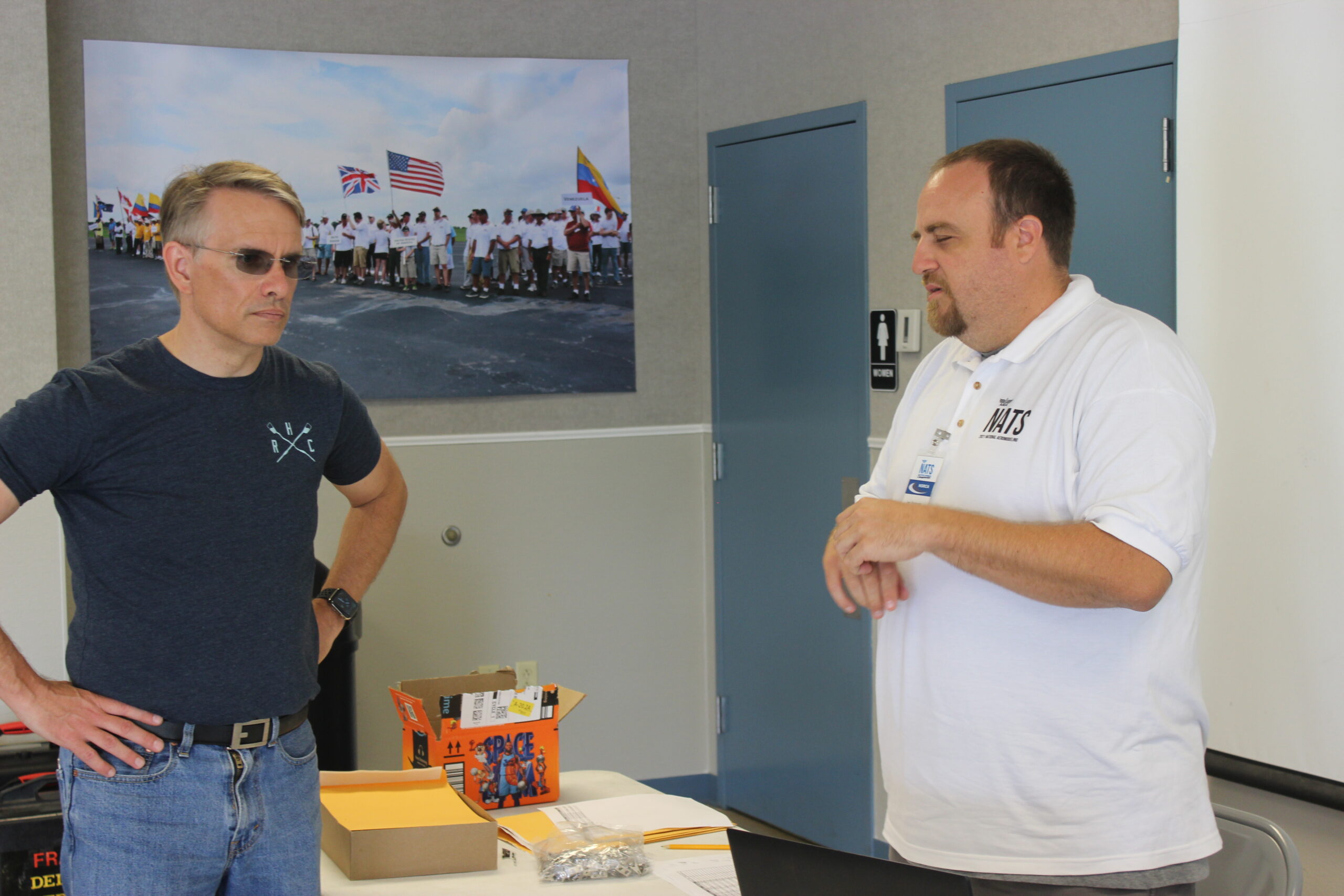 Peter joins ED Jon Dieringer to iron out some final details. Peter is explaining the problem he is having mounting the antennas high enough to communicate with the judges.