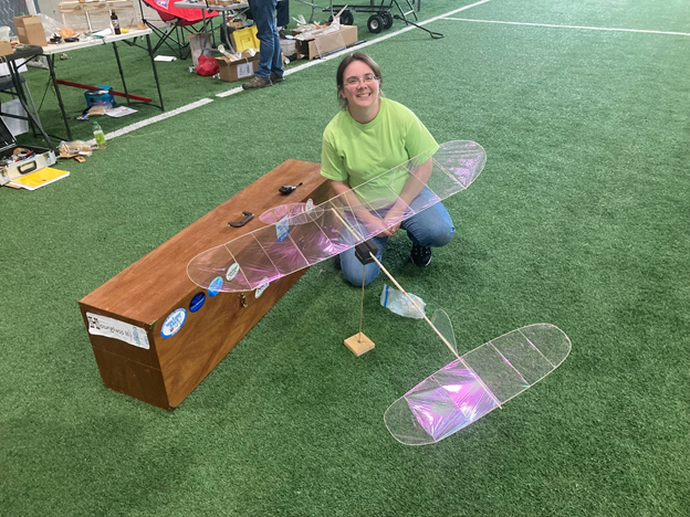 Below is Hope Finn with her Unlimited Stick. Just think of building the most delicate and frustrating model and this is it. This class is the king of the hill with ultimate high times of over an hour clocked at various times and venues. (Retraction, humble author stated their company was J&R Aerospace, its J&H!!!)