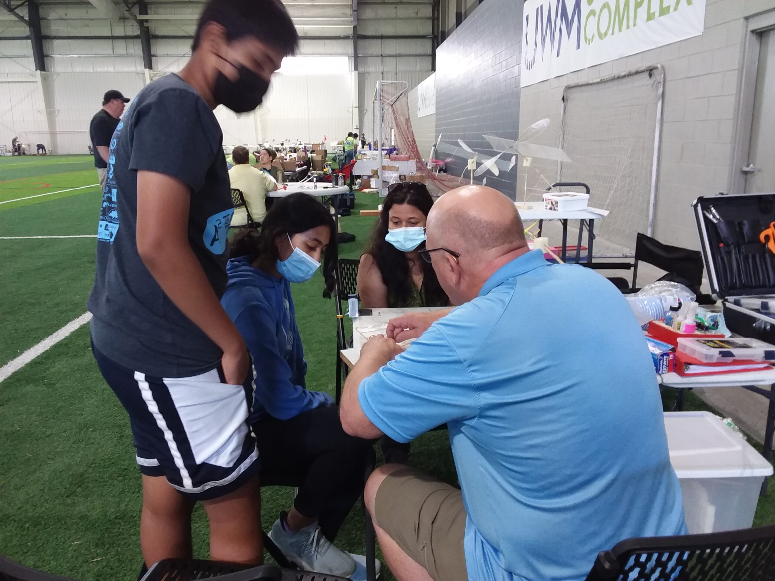 One team came in with a very badly damaged P-18, with at least 20 breaks in the wing. The damage occurred in the weather getting to the facility. While their initial reaction was dismay, we took it as an opportunity to teach repair skills. We demonstrated repairs on 2 or 3 breaks, and then guided the students as they effected repairs. There was hope! The wing began to take shape. A bit of carbon fiber (better, stronger, faster), and we began to hope for flight! After the first few trial flights, we set a goal of 1 minute. The kids already had big grins, yelling to their coach “It flew! It flew!”.