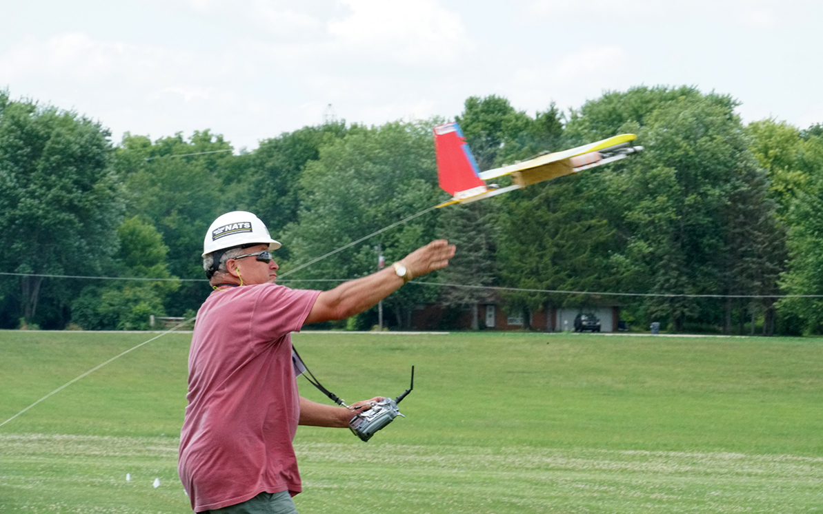 We started out the second day with GNAT Combat. GNAT airplanes are easy to build and are quite rugged because they are built out of coroplast and are all of the same design. They use a .15 engine that is legal for SSC and use the same 8 x 3 propeller without an rpm limit. Electrics are also able to compete and be competitive.