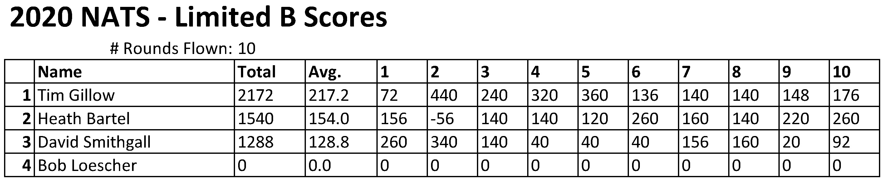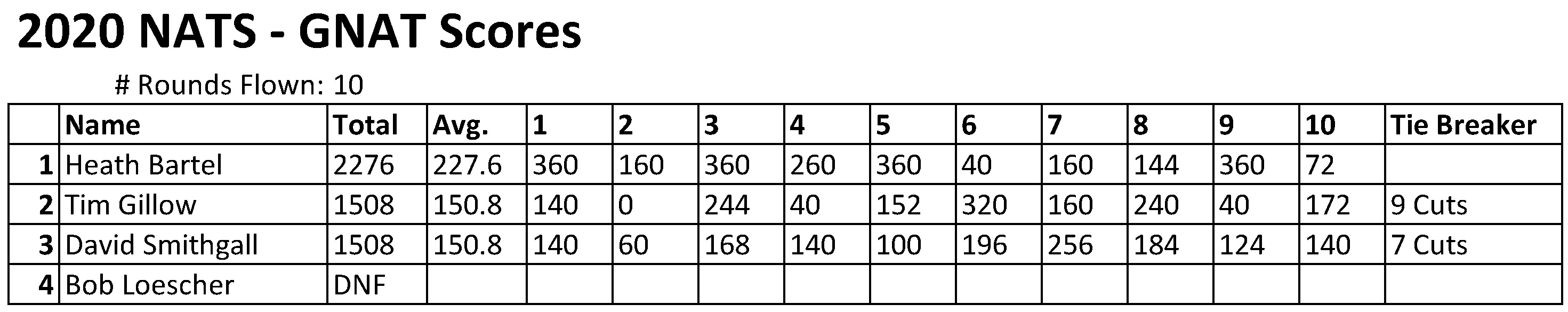 After all 10 rounds, there was a tie for second. Both Tim Gillow and David Smithgall ended with a score of 1,508 points. The tiebreaker went to the pilot with more cuts in the event. With only seven cuts, David Smithgall goes away empty handed in third. Tim Gillow took home the trophy for second place with a total of nine cuts. That leaves Heath Bartel with his electric GNAT to take home first with 2,276 points.