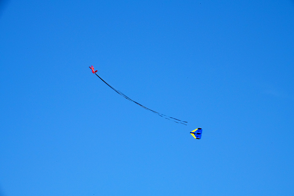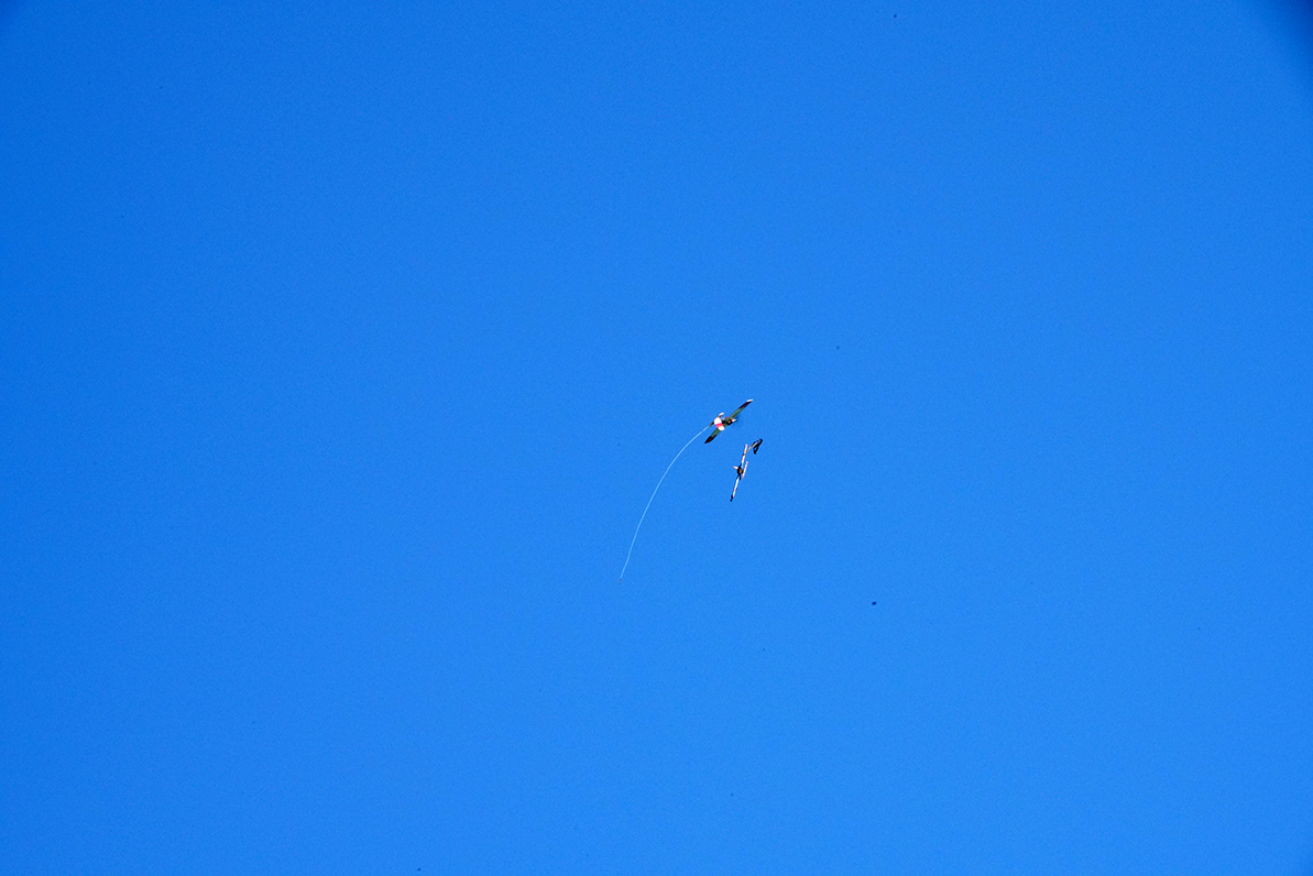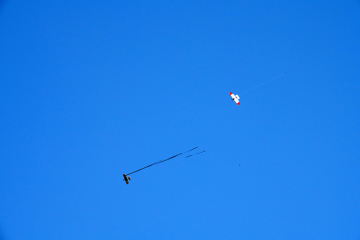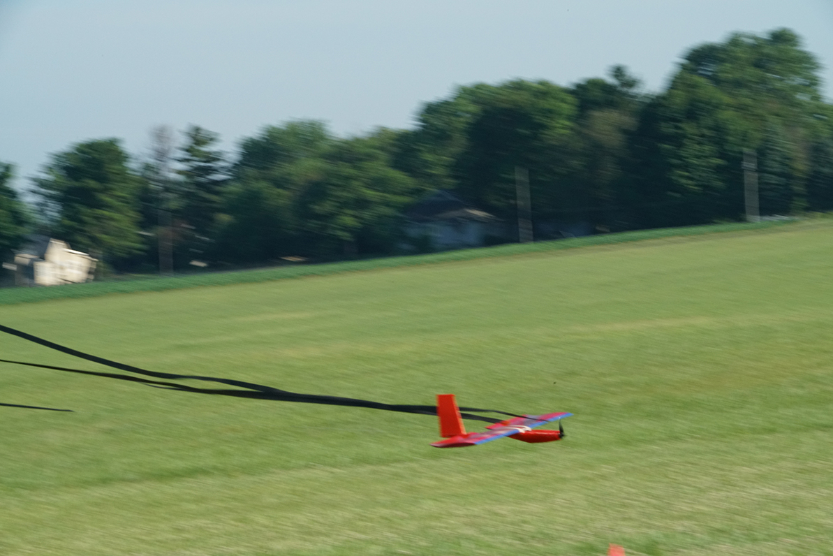 The ground was still covered in a heavy dew when we were ready to start. Normally, we would have used the red forestry tape. With the slower speeds and lighter weight of the planes, it was decided to try and use crepe paper. We did have the help of the Civil Air Patrol Cadets to throw the streamer up in the air while we launched. It ended up working out well. No one lost their streamer prior to start combat. Later on it became apparent that the right decision was made as Will Drumm's Arrow pulled David Smithgall's small plane around without breaking the crepe paper streamer.