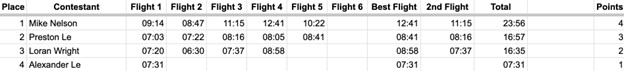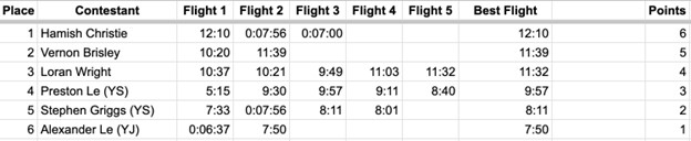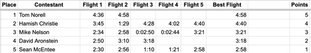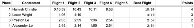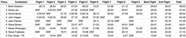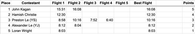 The final day of the Tagliafico World Cup concluded with a few position swaps. Most notably, Arend Borst bettered his backup time, moving him into second place. Shortly thereafter, Kang Lee landed a 29:20, moving him into second place and bumping Arend Borst into third.