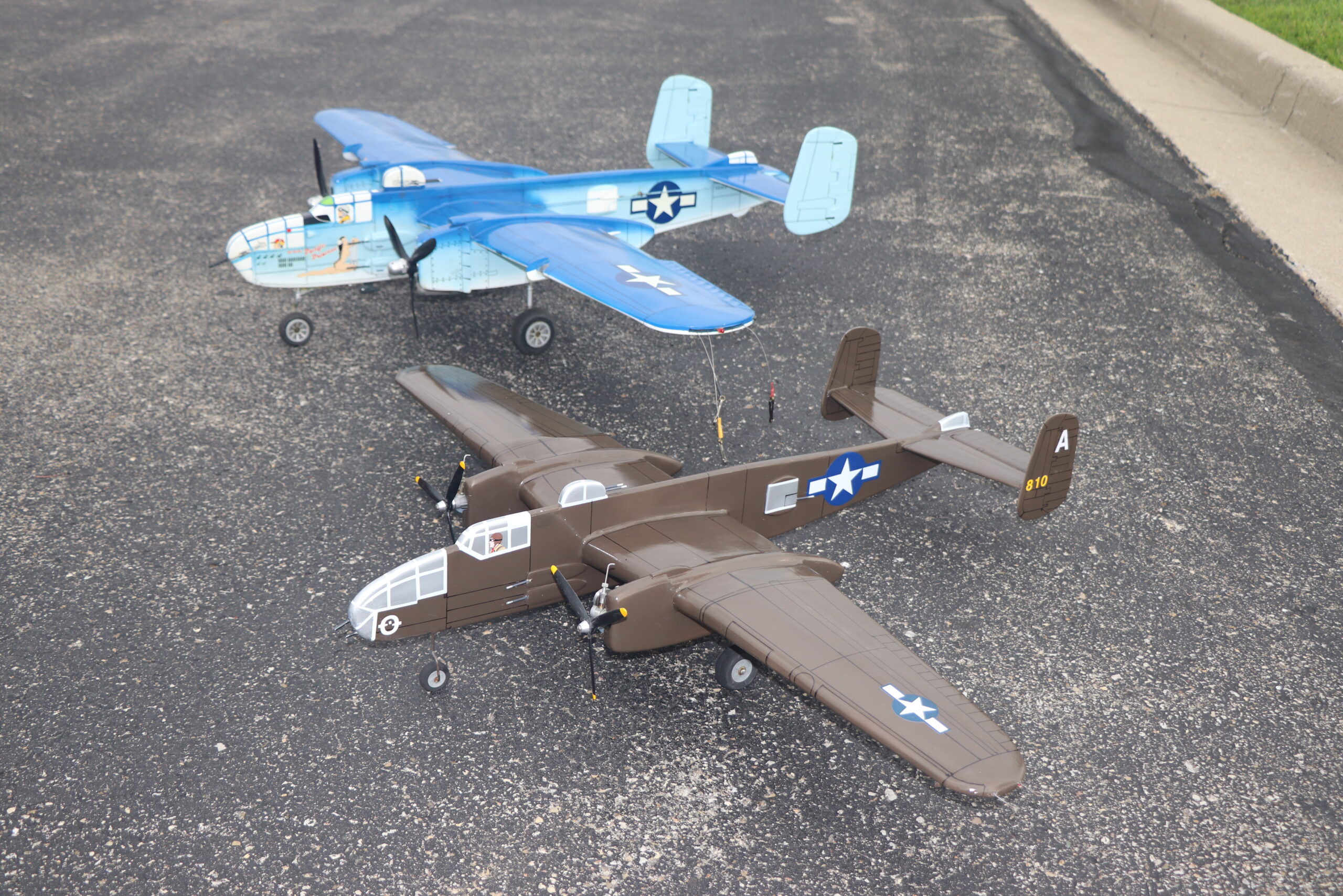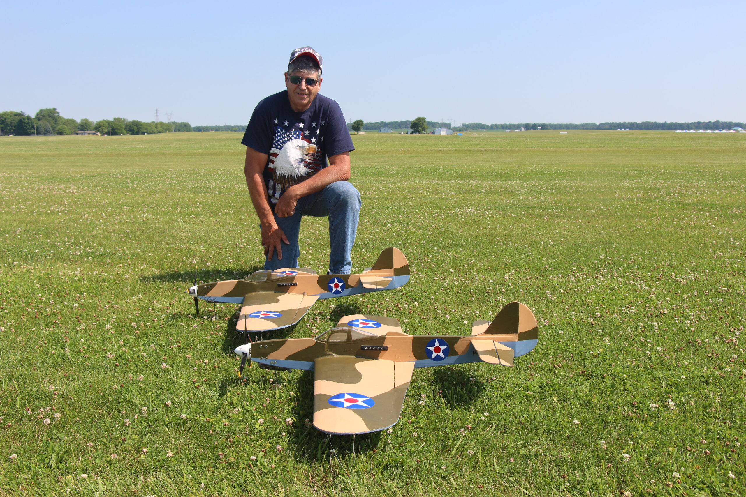 Christopher DeGroff with his first 1/2A Scale model (White model) and his second 1/2A Scale model (blue Wildcat).
