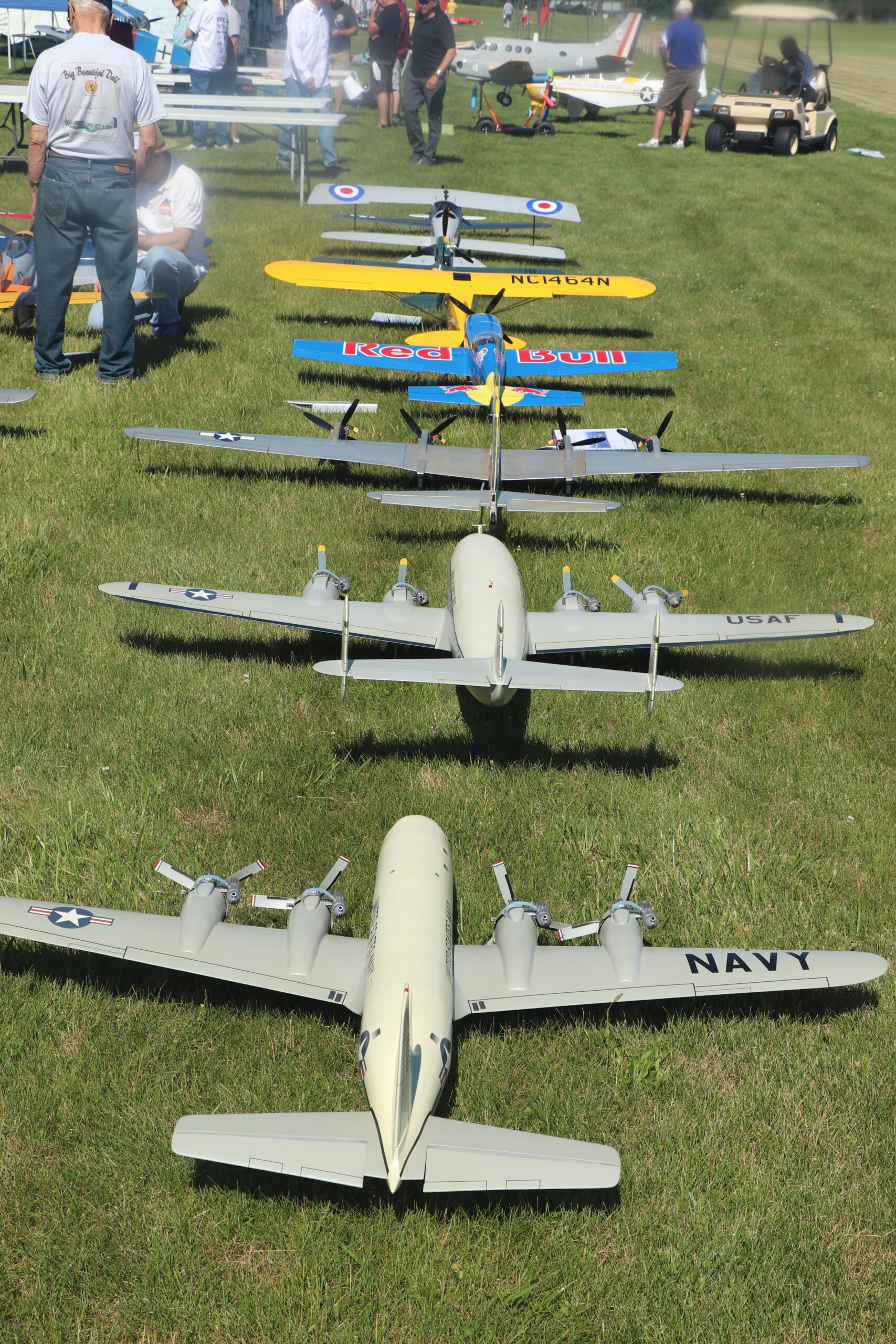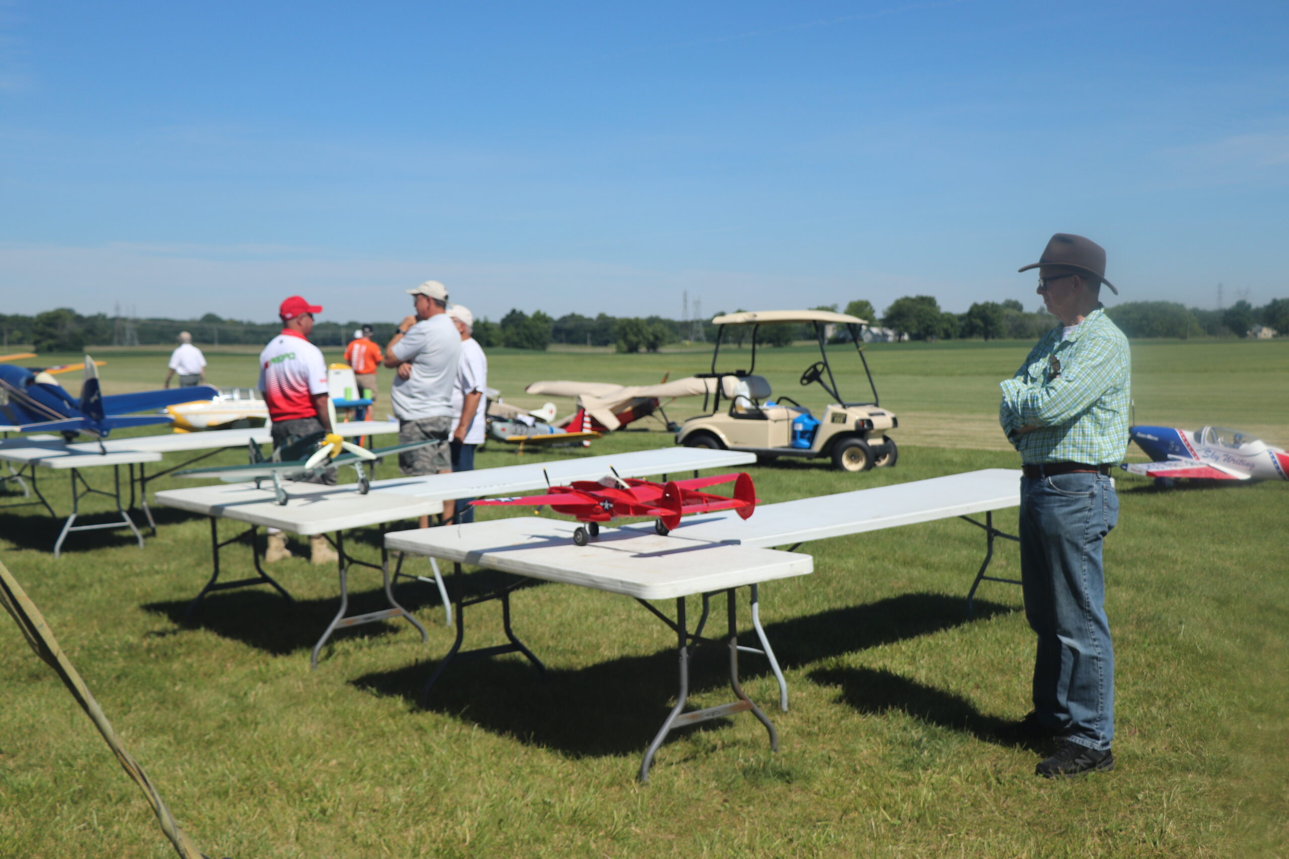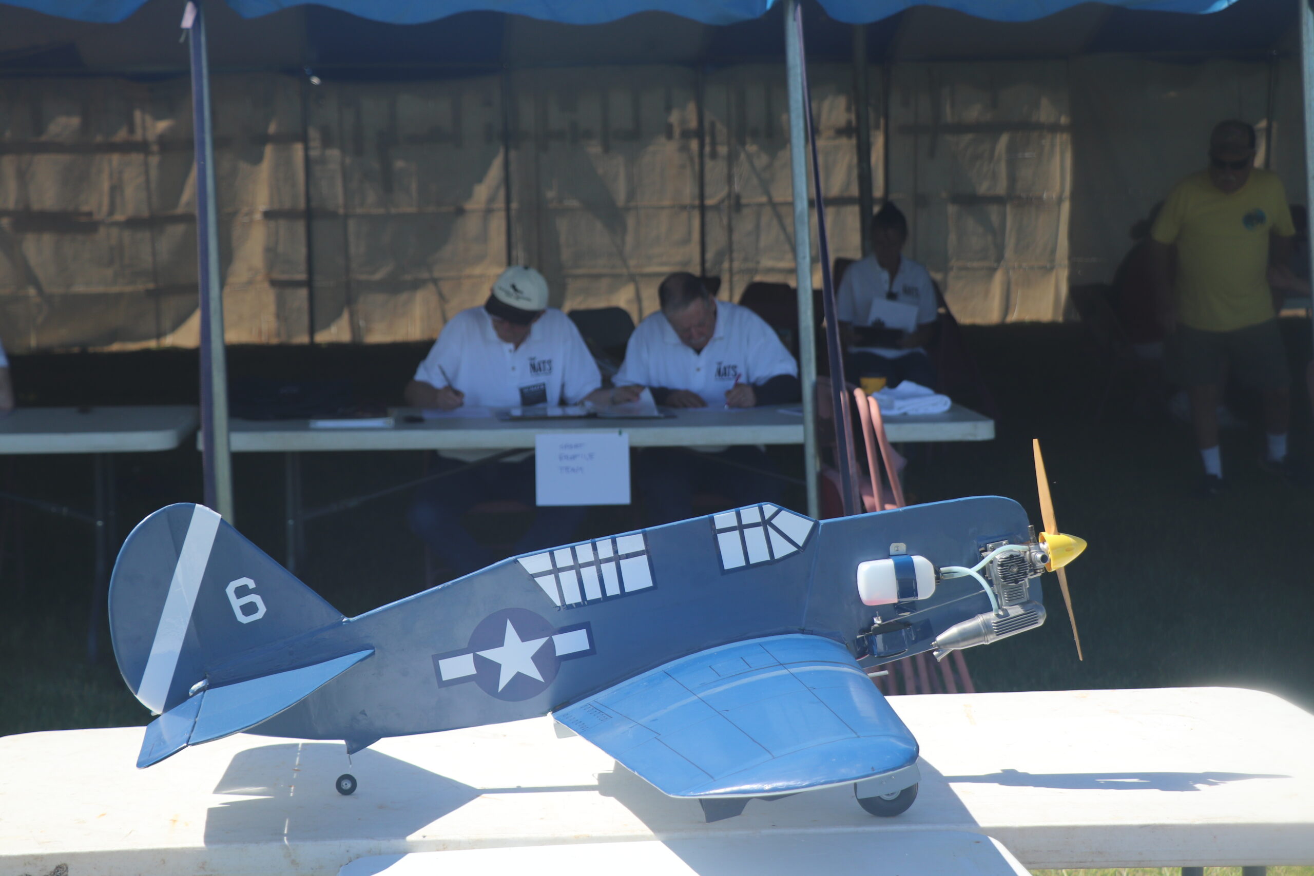 The static tables were positioned with the judges in the shade under the tent and the models in the sun so that the judges could see the details. The models were lined up and, one by one, were done with the static judging by 12:30 p.m. But we also had register and get the models weighed. The weight of the model is used to determine how much line pull is required before the models are flown.