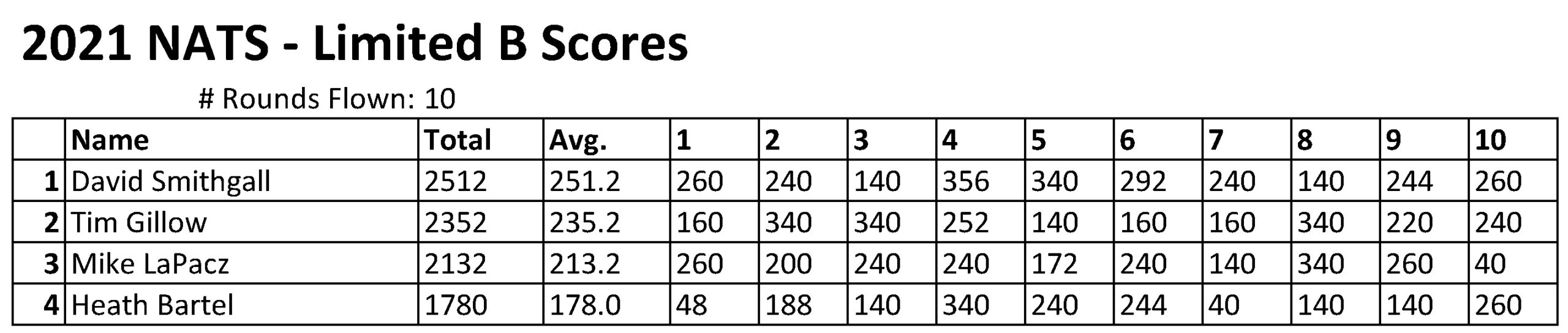 We again had only four pilots competing in Limited B. With the forecast not looking the greatest, we pushed on through the heat of the afternoon and completed all 10 rounds on Sunday. In third place was Mike LaPacz with 2,132. Tim Gillow ended up in second with 2,352. Bringing home the championship with a score of 2,512 was David Smithgall.