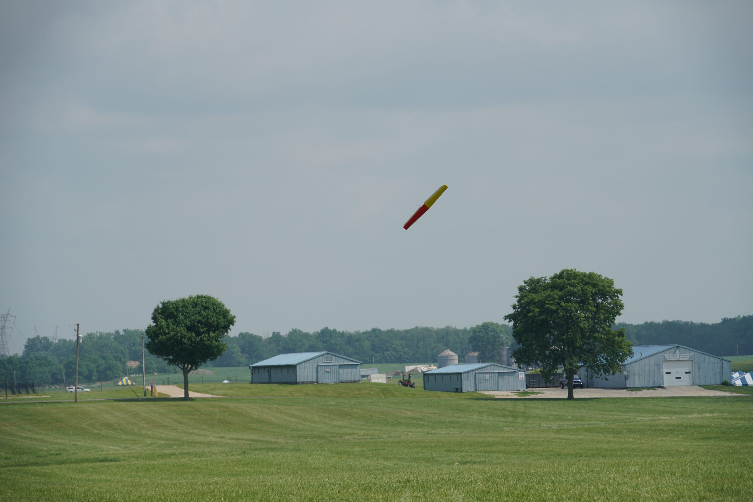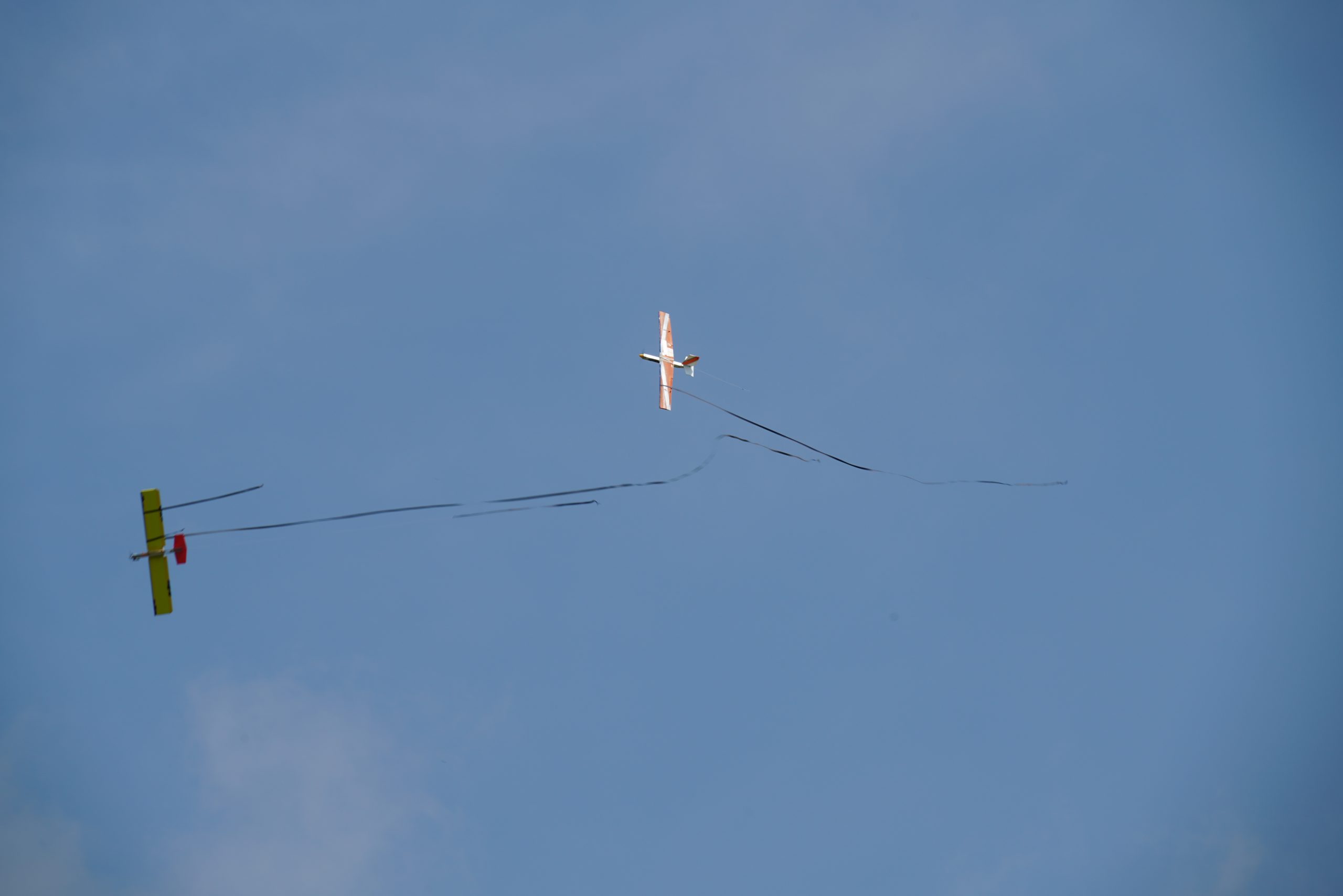 We had to start out with the red flagging tape streamers because of the dew yet on the grass. These can get wet and still stay together up in the air. We also had, at best, a crosswind and for the most part a tailwind. This made launching the SSC aircraft a bit challenging.