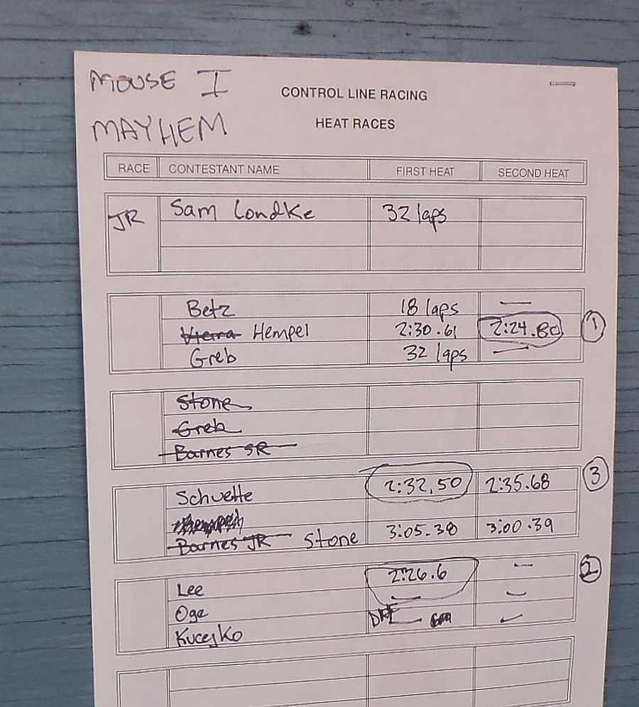 Almost everybody had severe troubles with the wind. Junior Sam Londke was a solo flight, which had engine troubles. Bill Lee and Patrick Hempel put in some outstanding times for first and second, just 2 seconds apart. Melvin Schuette ran a personal best 2:32 for third. The score sheet is posted here, and savvy readers can imagine the attrition rate by the number of scratched or short lap races!