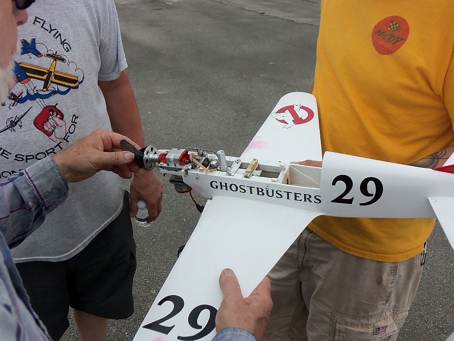 B Team Race was run for the first time in over a decade. This event was sponsored by T.J. Viera, who has put a lot of effort into reviving it. Competitors spent a considerable amount of time trying to make on-field adjustments before races started. One of Monday’s photos shows the guts of T.J’s plane, and the complexity of its mechanical setup.
