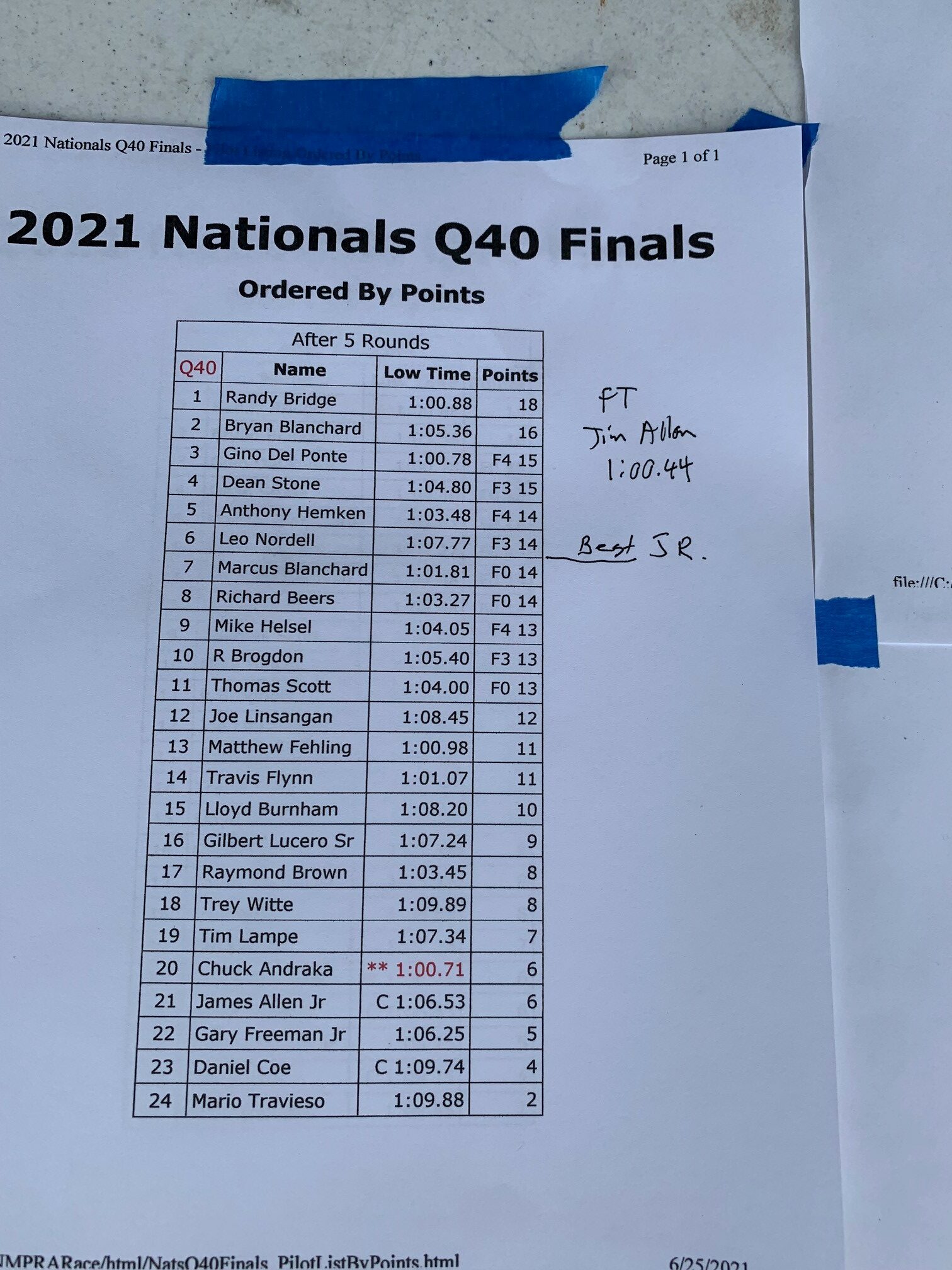 Moving on, like most all other finals, this was one was filled with lots of cuts and crashes. In the end, the winner was Randy Bridge and fast time went to Jim Allen with a 1:00.44. Randy was also overall Nats Champion for having the most combined points in 426 and 422. Great job Randy and well deserved.