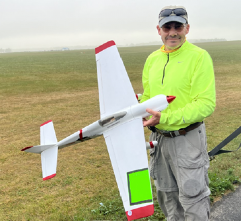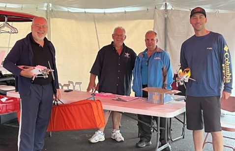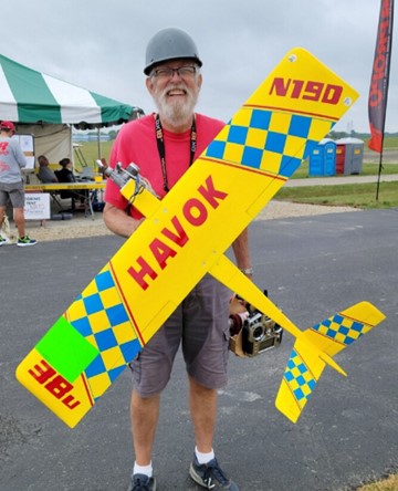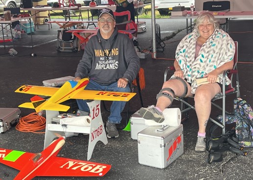 Steve Baker and his wife Christine, from Maryland, are trying to keep warm. Steve is racing two of his own designs. The yellow model is a Left Lane Exit, and the red plane is a Pitts Pellets. Steve has previously won best of show with his Pitts Pellets model.