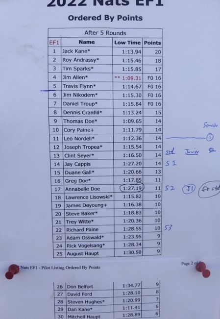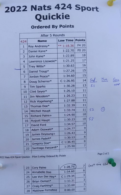 We had 30 pilots in EF1 and 28 pilots in 424. These two events are considered entry-level events. Both classes are run in a single matrix with a breakout time to determine Standard and Expert. The EF1 breakout time was 1:27 and for 424 it was 1:30. On top of that, we had two junior pilots and one senior competing as well.\